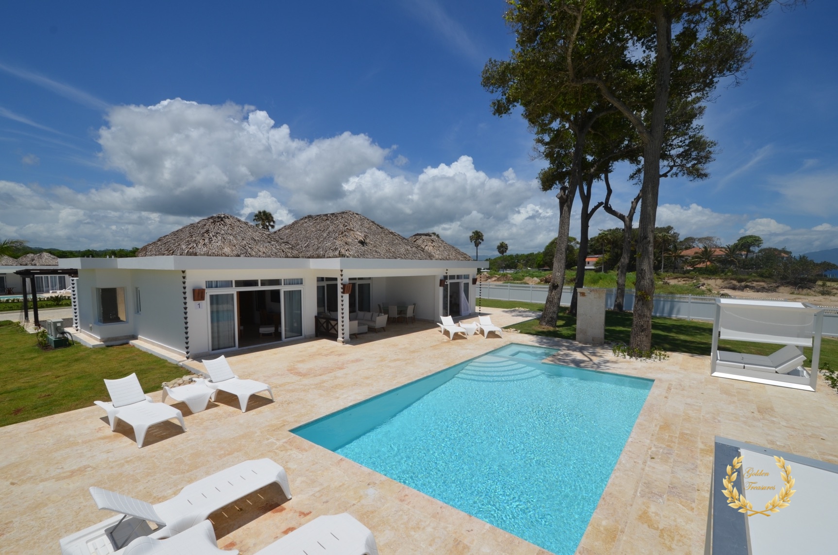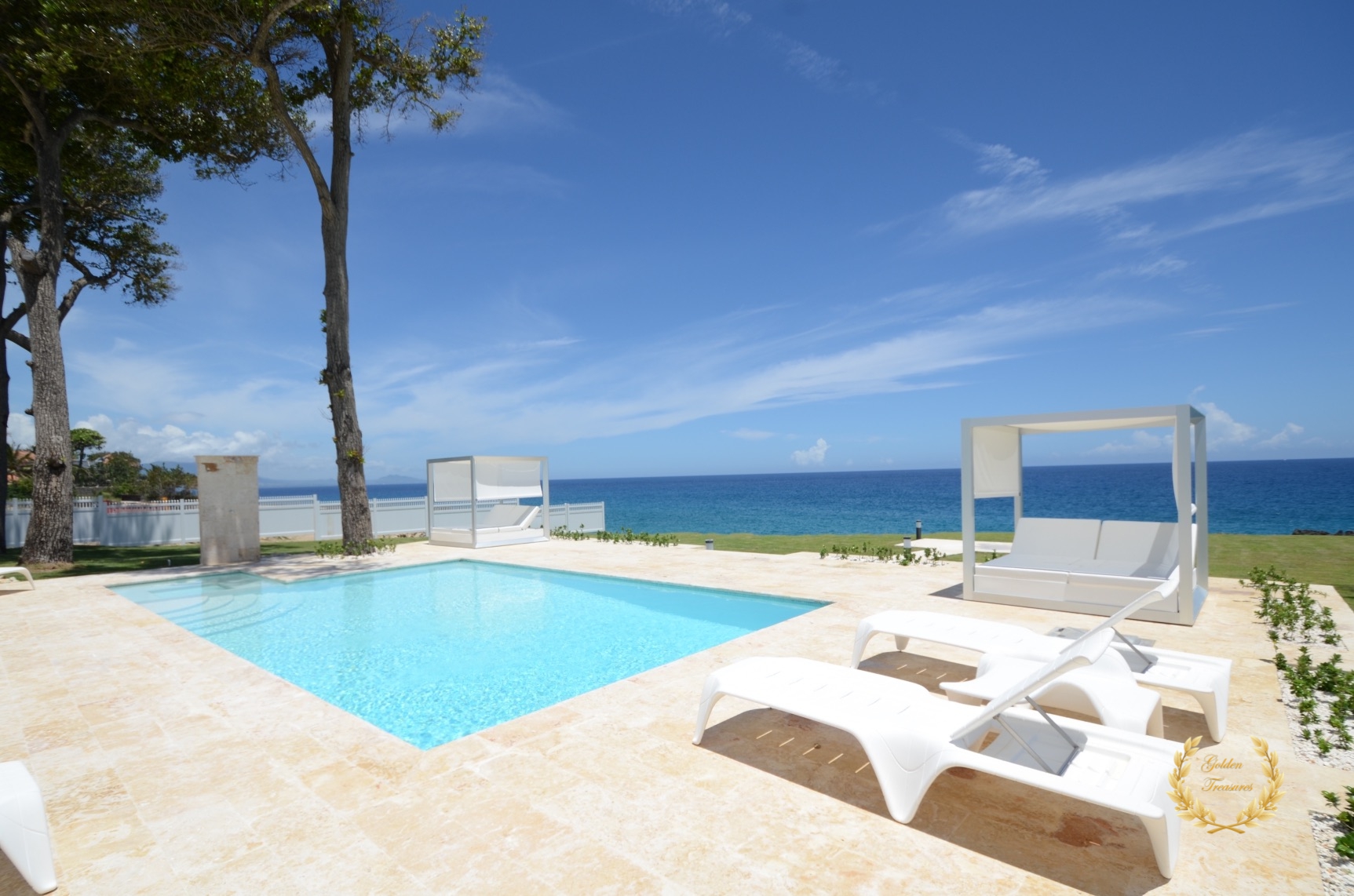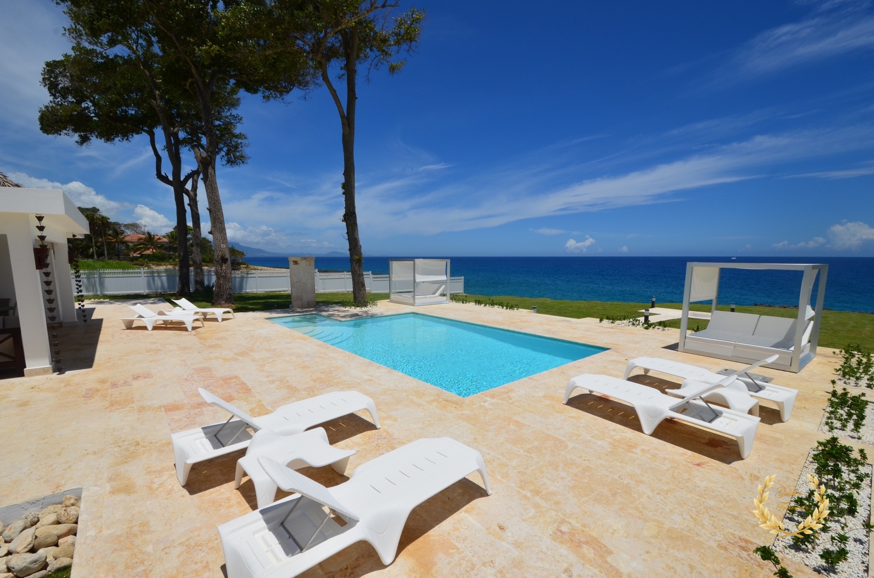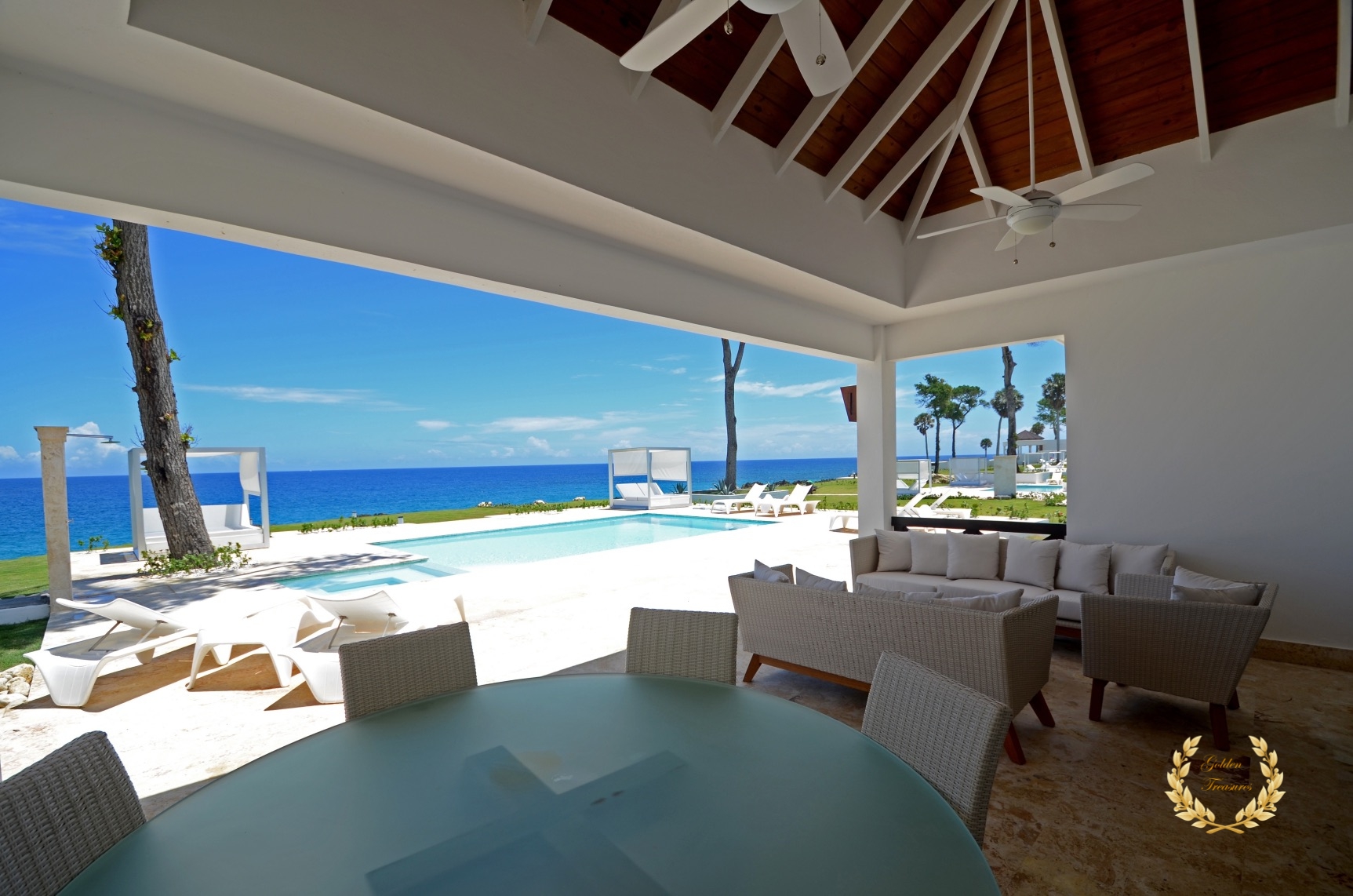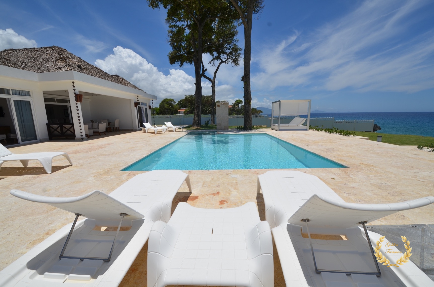 Its floor plan distributes three bedrooms and three bathrooms around a centered living room with tall wooden ceiling; a custom design luxury kitchen, dining area, media area and a veranda with splendid ocean views. Outside, the private swimming pool sits meters from the ocean shore, with awesome vistas. Sun beds by the coral stone deck complement the deluxe chaise lounges by the swimming pool, and the veranda lounge and dining furniture add an ideal setting for enjoying the outdoor in the shade if too sunny for a guest.