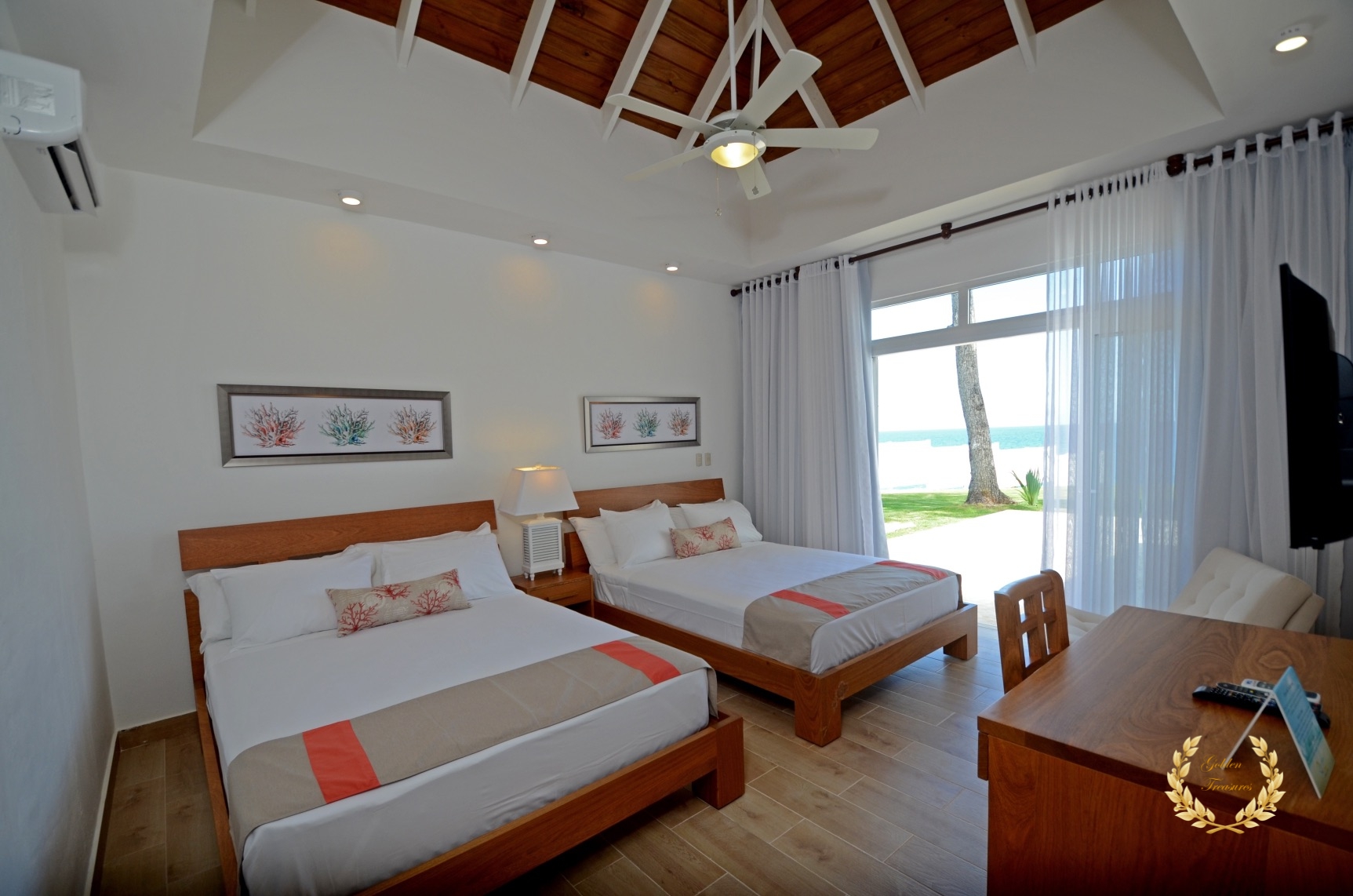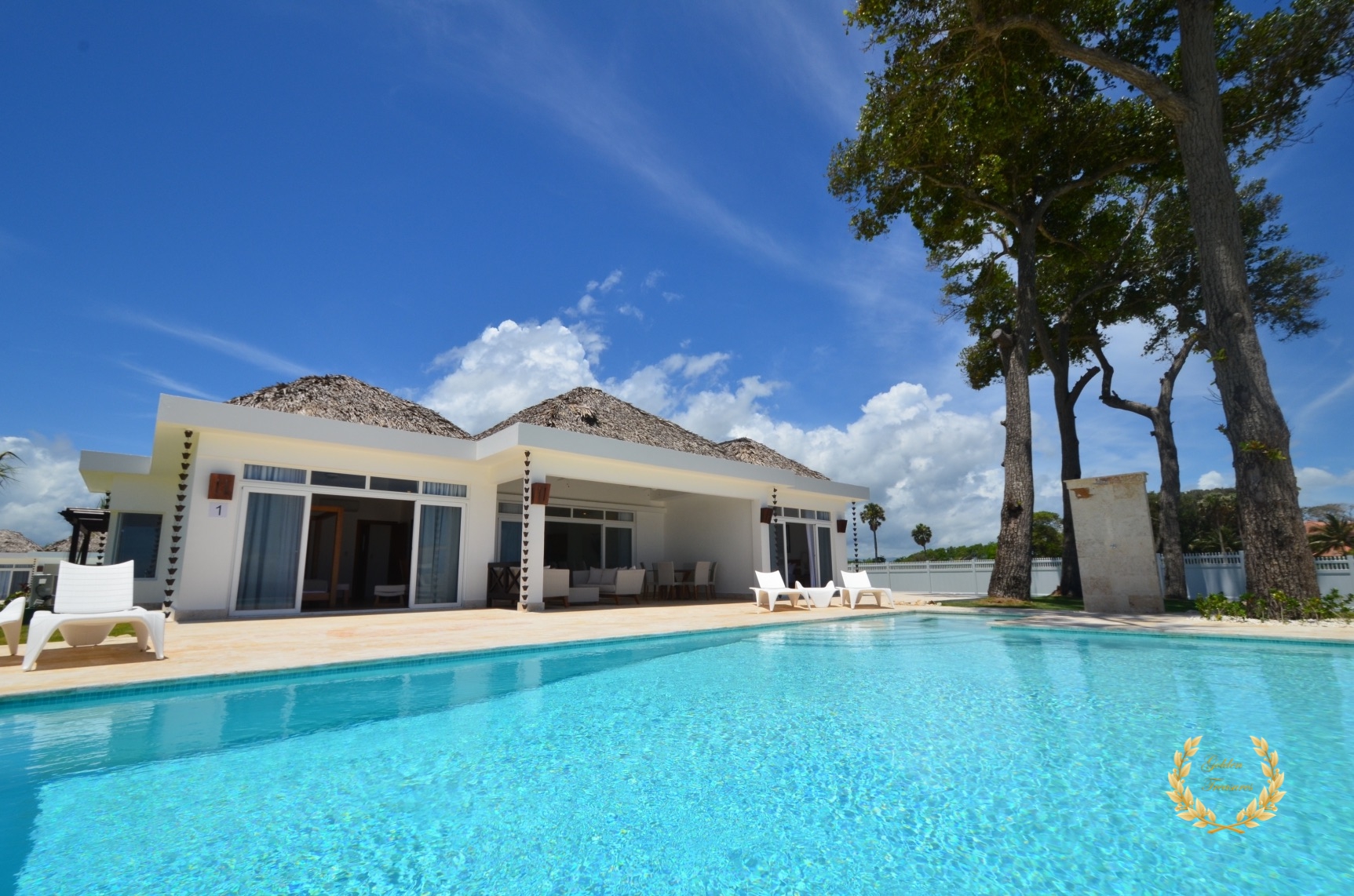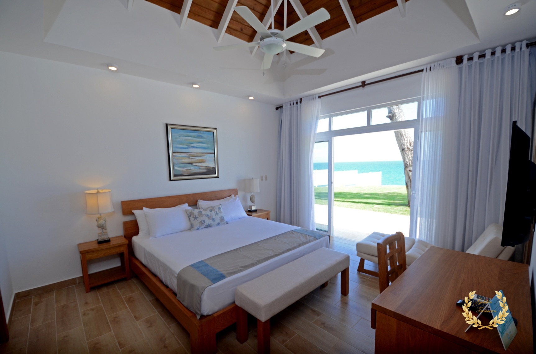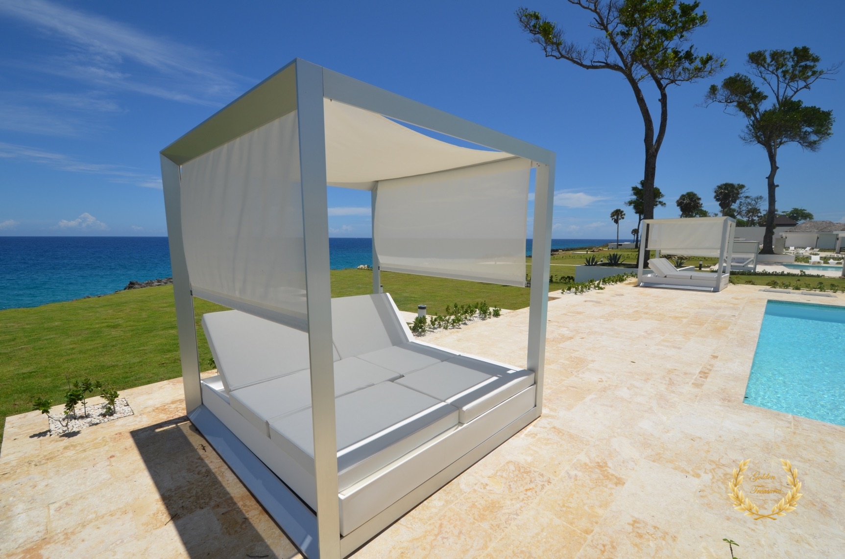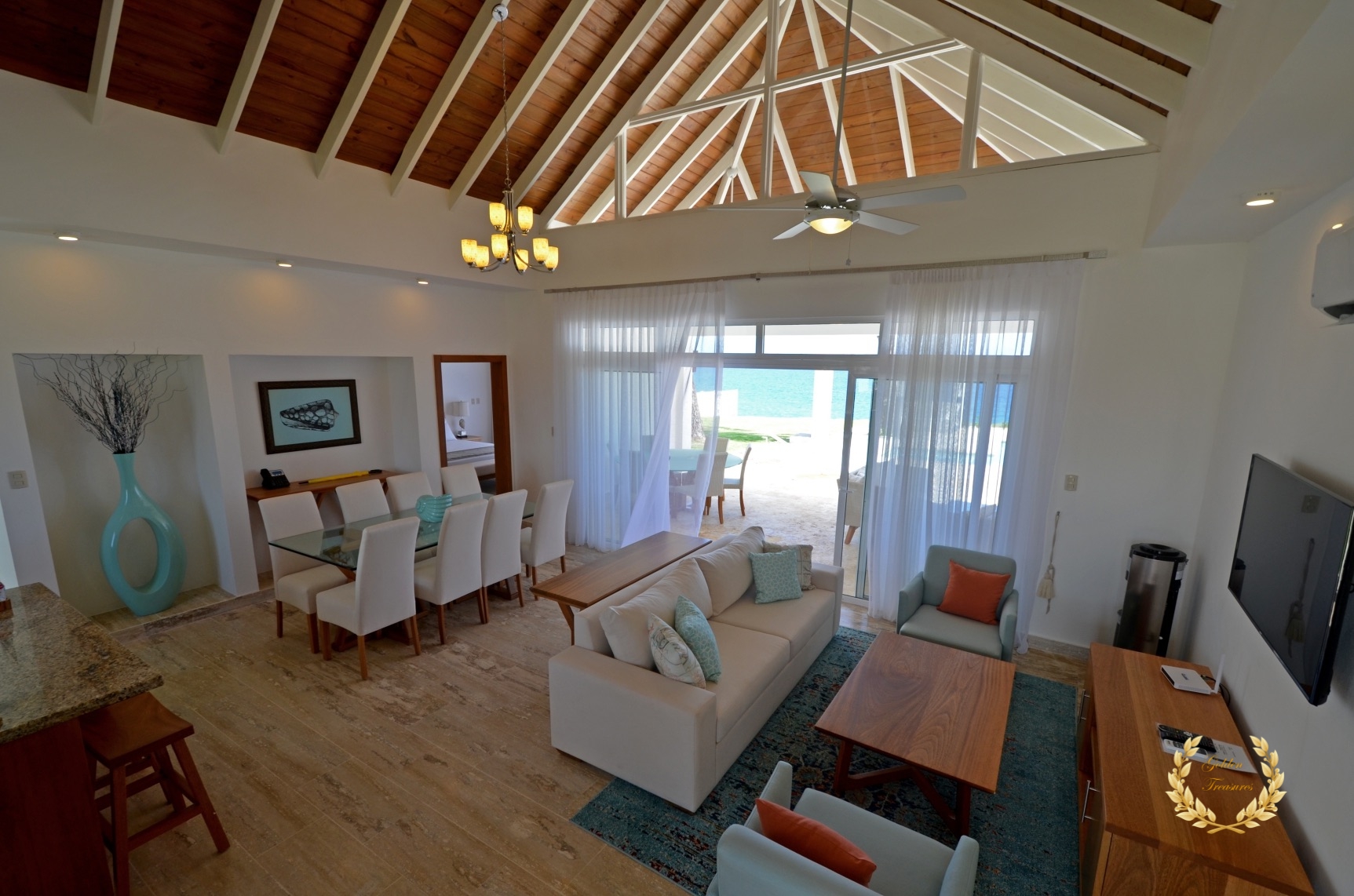 Its floor plan distributes three bedrooms and three bathrooms around a centered living room with tall wooden ceiling; a custom design luxury kitchen, dining area, media area and a veranda with splendid ocean views. Outside, the private swimming pool sits meters from the ocean shore, with awesome vistas. Sun beds by the coral stone deck complement the deluxe chaise lounges by the swimming pool, and the veranda lounge and dining furniture add an ideal setting for enjoying the outdoor in the shade if too sunny for a guest.