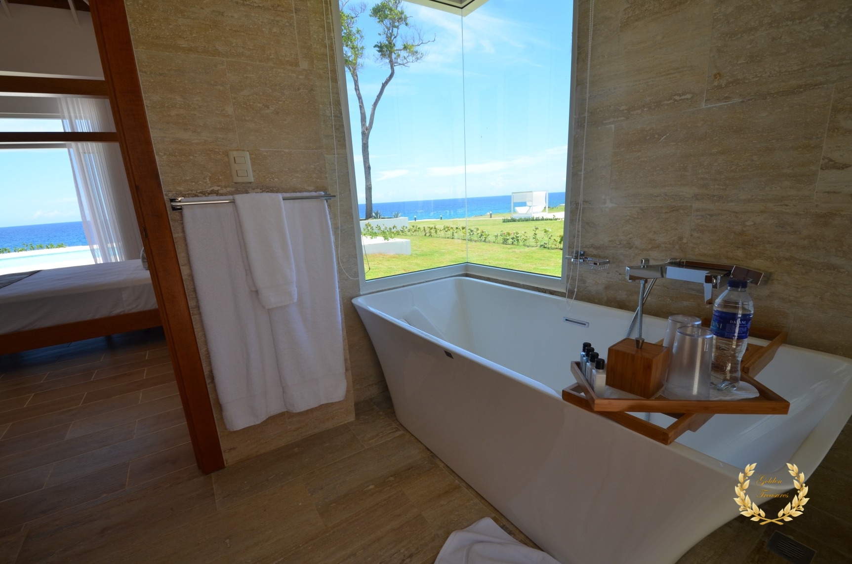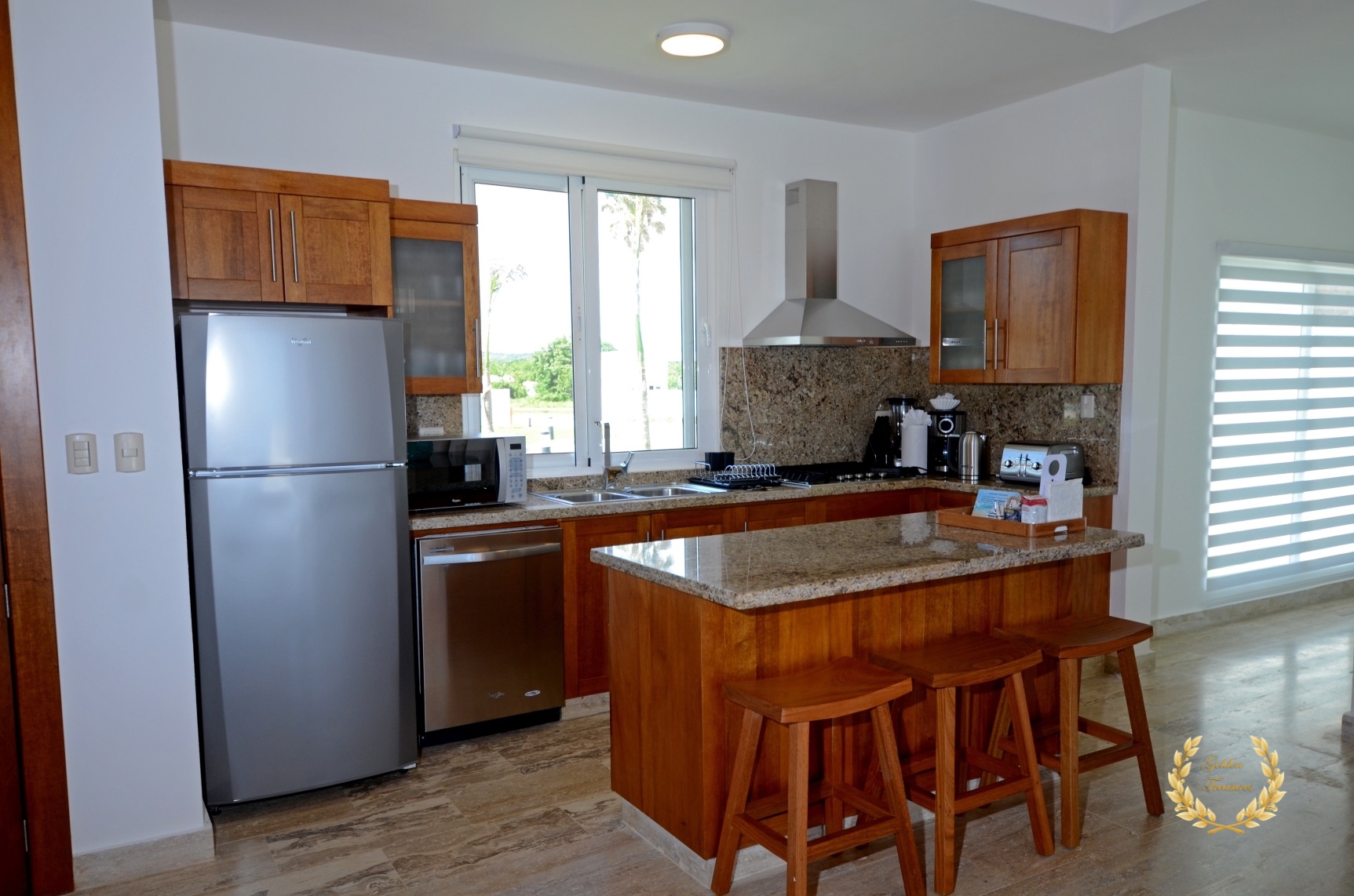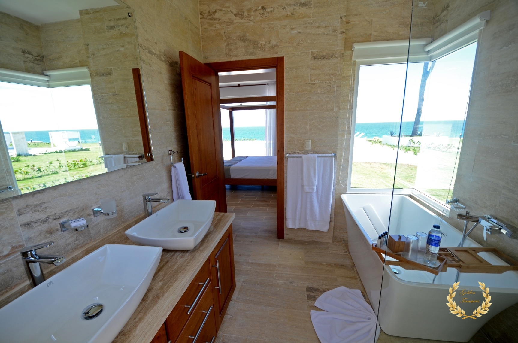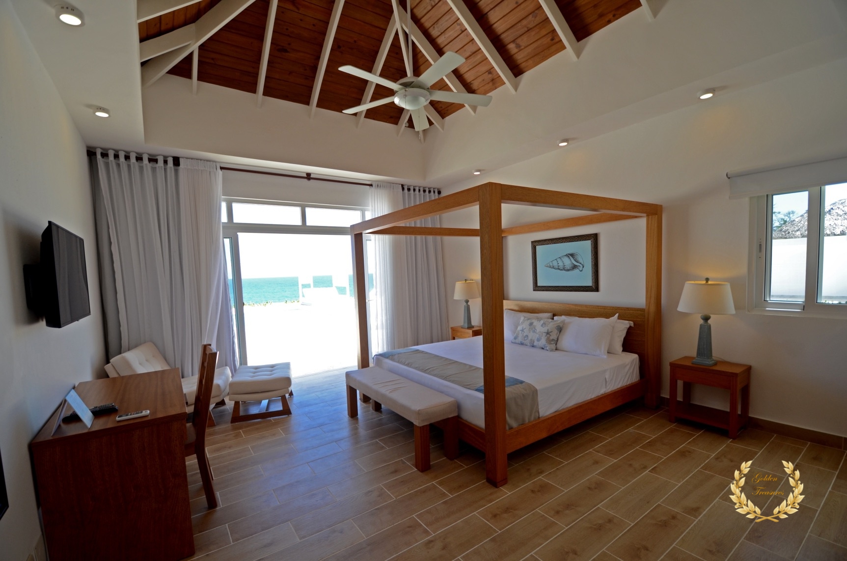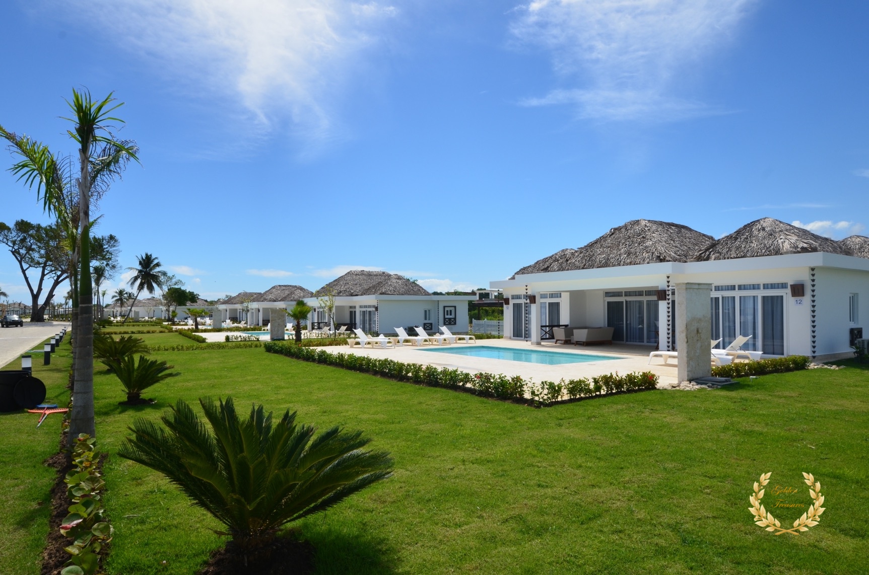 Its floor plan distributes three bedrooms and three bathrooms around a centered living room with tall wooden ceiling; a custom design luxury kitchen, dining area, media area and a veranda with splendid ocean views. Outside, the private swimming pool sits meters from the ocean shore, with awesome vistas. Sun beds by the coral stone deck complement the deluxe chaise lounges by the swimming pool, and the veranda lounge and dining furniture add an ideal setting for enjoying the outdoor in the shade if too sunny for a guest.